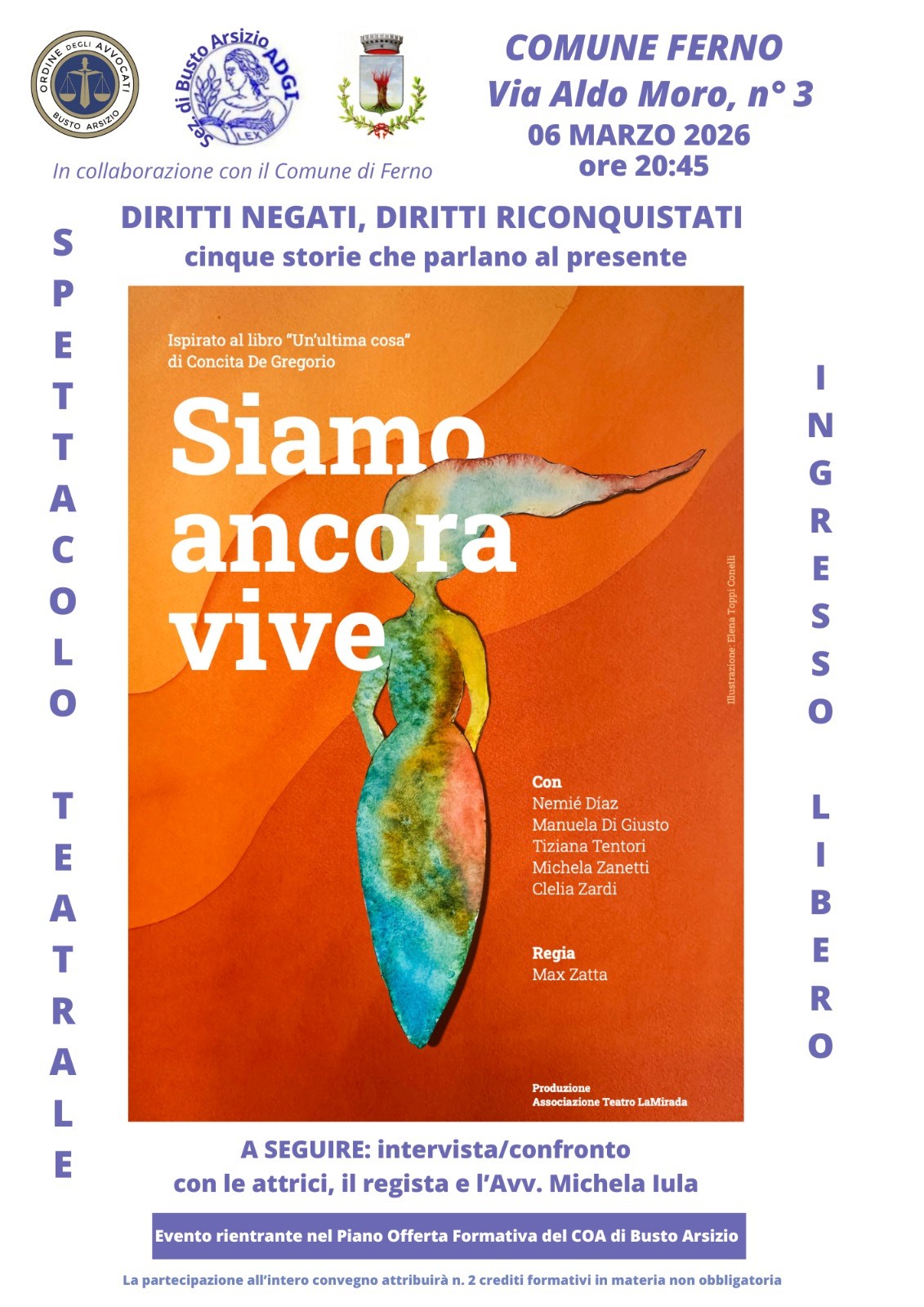 ADGI - Sezione Busto Arsizio, con la collaborazione del Comune di Ferno e dell'Ordine degli Avvocati di Busto Arsizio, invita la cittadinanza allo spettacolo dedicato al contrasto alla violenza di genere intitolato “Siamo ancora vive”.